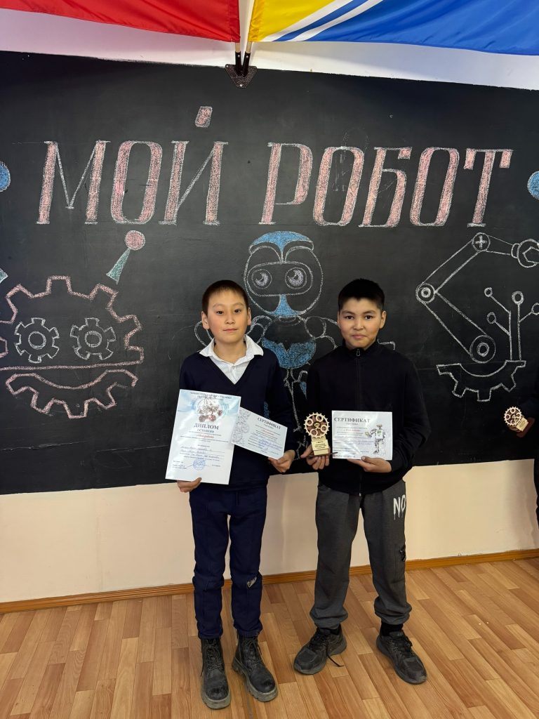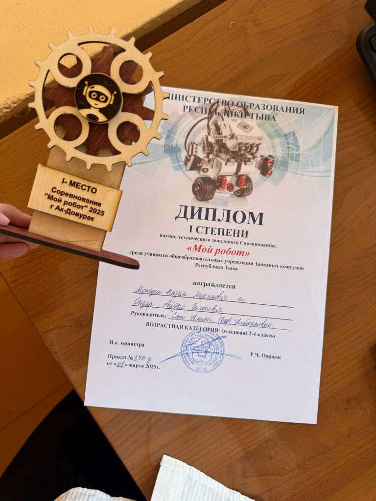 1 апреля 2025г обучающиеся объединения «Робототехника» Монгуш Назын и Ондар Айдыс участвовали в научно-техническом зональном соревновании «Мой робот» в г. Ак-Довурак. Заняли 1 место🥳